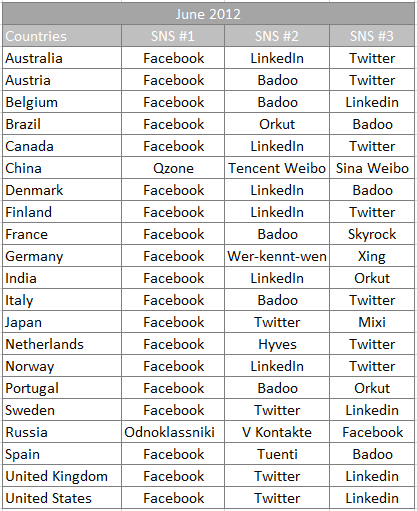 以下表格所顯示的是在各個(gè)歐洲國(guó)家、美國(guó)、巴西、中國(guó)、印度、俄羅斯、英國(guó)、澳大利亞、加拿大和日本等市場(chǎng)上占據(jù)第二主導(dǎo)地位的社交網(wǎng)絡(luò),基本上都是職業(yè)社交網(wǎng)站 LinkedIn、英國(guó)社交網(wǎng)絡(luò)Badoo和Twitter,僅有少數(shù)例外