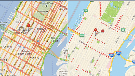 顯而易見地,現(xiàn)在的蘋果地圖在地理信息上還無法和Google相提并論。Google Maps比蘋果地包含了更多的街道名稱、更詳細(xì)的道路信息等。