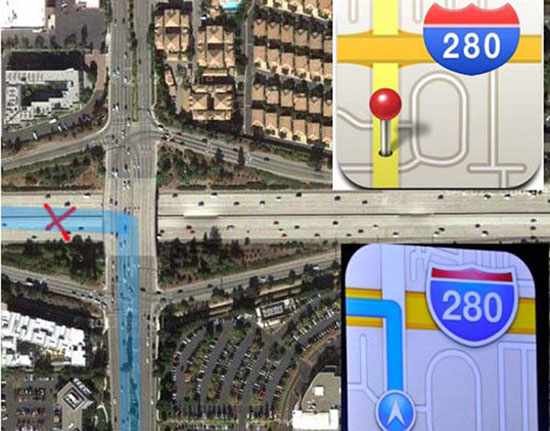 這個問題比較嚴(yán)重,蘋果地圖將用戶的方向指向了橋下。蘋果地圖的logo分明就是死亡地帶。
