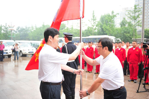 徐德明將寫有“科學(xué) 精準(zhǔn) 優(yōu)質(zhì) 高效”字樣的旗幟授予測繪隊(duì)員