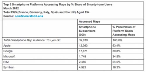 最近c(diǎn)omScore針對(duì)歐洲手機(jī)用戶使用地圖功能的情況做了一份調(diào)查報(bào)告,還是值得一看的。根據(jù)2012年3月的數(shù)據(jù),在法國、德國、意大利、西班牙和英國這五個(gè)國家里,共有3980萬個(gè)用戶通過移動(dòng)設(shè)備使用地圖服務(wù),占智能手機(jī)用戶總數(shù)的35%,當(dāng)中有40.2%的人是英國人。跟去年比起來,智能手機(jī)地圖服務(wù)使用量增加了55%。有趣的是,從Google地圖服務(wù)使用情況來看,Android手機(jī)僅占總數(shù)的39.8%,而蘋果手機(jī)卻達(dá)到了53.4%!