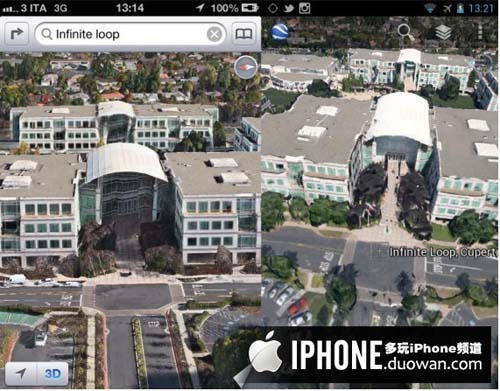 兩款應(yīng)用最明顯的一個(gè)區(qū)別就是它們在處理3D試圖和體驗(yàn)方面的做法。在iOS6中的3D地圖應(yīng)用,3D按鍵是在屏幕左下方,點(diǎn)擊這個(gè)按鍵可進(jìn)入3D視圖;但是在Android上則是通過GoogleEarth應(yīng)用獲得,用戶點(diǎn)擊圖層按鈕,選擇3DBuildings后可進(jìn)入3D地圖視圖。