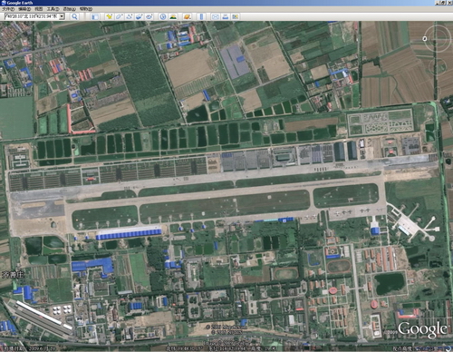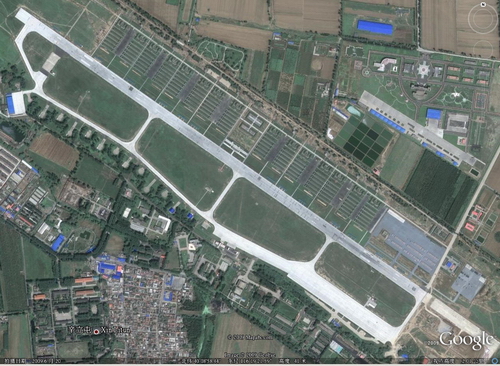相比于東郊閱兵村清晰的衛(wèi)星圖片,北郊和南郊閱兵村在Google Earth上就不是那么搶眼。北郊閱兵村位置在沙河機(jī)場(chǎng),具體位置是40°8'56.46“北,116°19'14.15”東,衛(wèi)星照片顯示時(shí)間是今年6月20號(hào),我們只能夠看到一排排整齊的營(yíng)房和車(chē)輛,而跑道上并沒(méi)有人員方陣正在訓(xùn)練。