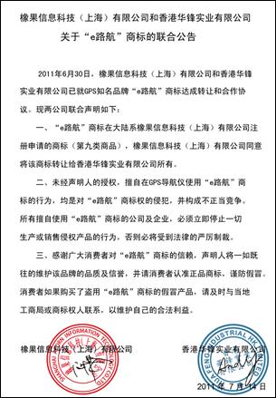 橡果和華鋒關(guān)于“e路航”商標(biāo)的聯(lián)合聲明