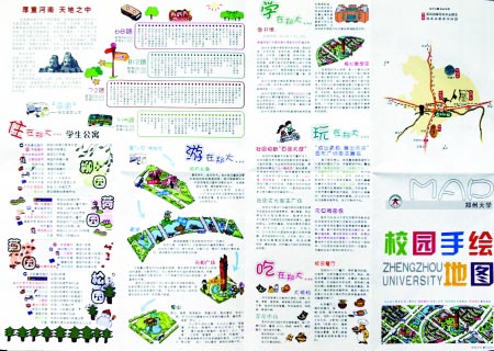 去哪里打籃球、在哪里吃飯,看病去哪兒,通過(guò)一張薄薄的紙就可知曉。這是一份手繪地圖,更是送給新生的一份“生活指南”(如圖)。今年,鄭州大學(xué)錄取通知書(shū)大“變身”,從今天起,考入鄭大的新生就會(huì)收到這樣一份特殊禮物。