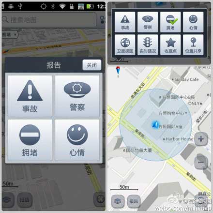 根據(jù)其官方微博的介紹,高德地圖無論是Android版還是iPhone版都提供了一個類似于分享的功能,用戶登錄高德地圖后,點擊左下角的“報告”(Android版本)或者“交通互助”(iPhone版本)按鈕,選擇“擁堵”或“事故”就可以分享相關內容。