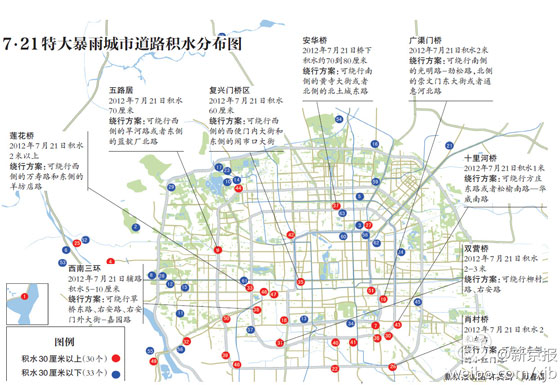 除了這些專業(yè)的地圖服務商外,媒體也在通過他們的方式將道路積水信息告知給讀者。例如《新京報》在“7.21特大暴雨”的第二天就推出過一次積水示意圖,今天該報又再次繪制了一份更為詳細的“7.21特大暴雨城市道路積水分布圖”,以“積水30厘米”為標準展現(xiàn)了全市的積水分布,并對城區(qū)內重要的積水路段進行了說明,而且提供了繞行方案,相當實用,大家可以下載下來放在手機里備用。
