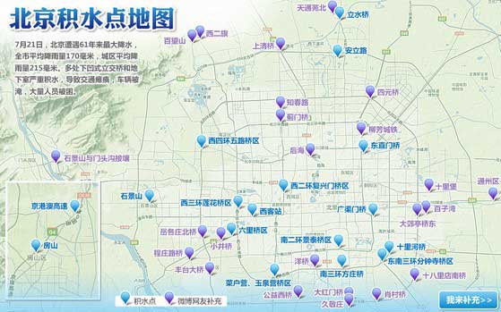 騰訊新聞在網(wǎng)絡上制作了一張“北京積水點地圖”,數(shù)據(jù)也是來自7月21日的那場暴雨。在這張地圖上,騰訊新聞提供了“我要補充”的按鈕,借助騰訊龐大的用戶群,通過騰訊微博提交積水路段,經過核實后的積水信息以“微博網(wǎng)友補充”的標記展示在地圖上。