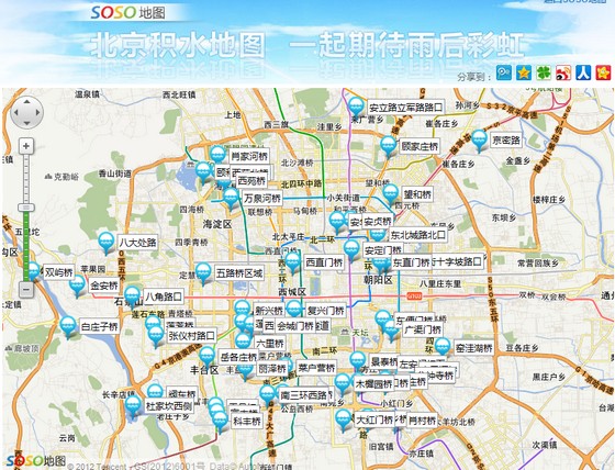 由于下水管線等基礎設施的排水能力只能適應每小時36到45毫米的降雨,7月21日的特大暴雨讓北京城變成了一片“澤國”,多個立交橋下的積水都能夠將汽車淹沒,甚至造成了人員的傷亡。下雨的時候哪些地方容易積水,最新的狀況是什么,這就成為大家想迫切了解的信息。在地圖上對容易積水的地點進行標注可謂是最直觀的一種方式,雖然昨夜這場預報的暴雨與京城爽約,但那些容易積水的路段仍然需要牢記在心。那么,讓我們看看在汛期的北京哪些互聯(lián)網(wǎng)地圖和手機地圖是需要常備的。以下信息通過新浪微博匯集。