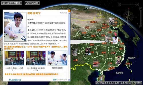 “尋找最美鄉(xiāng)村教師”地理信息服務(wù)是衛(wèi)星測繪應(yīng)用中心繼紅色地圖服務(wù)之后的又一社會化應(yīng)用,進一步拓展了地理信息服務(wù)領(lǐng)域,取得了較好的社會反響,得到了中央電視臺和光明日報社的充分肯定?;顒訉⒂诮衲杲處煿?jié)前舉辦盛大的頒獎晚會,為獲獎的最美鄉(xiāng)村教師授獎。