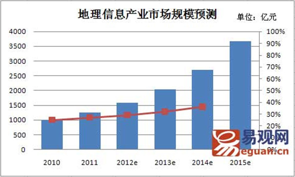 國內(nèi)空間地理信息產(chǎn)業(yè)從90年代末起步,經(jīng)過20多年發(fā)展,產(chǎn)業(yè)已發(fā)展至千億級規(guī)模。而著眼未來,今后10年仍將是空間地理信息產(chǎn)業(yè)的黃金發(fā)展期。根據(jù)易觀研究預(yù)測,到2015年,國內(nèi)空間地理信息產(chǎn)業(yè)規(guī)模將突破3000億元,相比2010年的1000億元增長3.6倍!