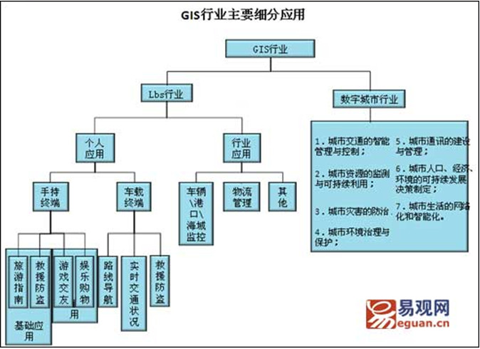 伴隨著GIS行業(yè)的發(fā)展和創(chuàng)新,易觀國際認(rèn)為未來在數(shù)字城市,車載導(dǎo)航,LBS應(yīng)用三個領(lǐng)域?qū)⒂休^大發(fā)展,市場進(jìn)一步細(xì)分,帶動三個相關(guān)產(chǎn)業(yè)的進(jìn)一步繁榮。