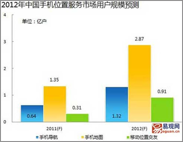 易觀認(rèn)為,GIS消費(fèi)應(yīng)用中最具投資價值的細(xì)分市場還是LBS領(lǐng)域。伴隨著移動互聯(lián)網(wǎng)的普及、GPS手機(jī)的快速增長及高精度定位技術(shù)的應(yīng)用,LBS市場將迅速發(fā)展。如下圖所示:2012年中國手機(jī)位置服務(wù)市場用戶規(guī)模同比增長50以上,手機(jī)導(dǎo)航、手機(jī)地圖、移動位置交友分別將達(dá)到1.32億、2.87億、0.91億。龐大的用戶數(shù)將帶來LBS領(lǐng)域市場的將帶來GIS消費(fèi)市場的巨大空間。