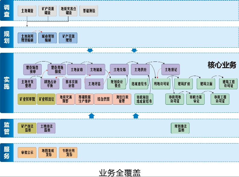 國(guó)土資源信息化是國(guó)民經(jīng)濟(jì)和社會(huì)信息化的重要組成部分,通過(guò)在國(guó)土資源調(diào)查評(píng)價(jià)、規(guī)劃、管理、保護(hù)和合理利用等各項(xiàng)工作中廣泛應(yīng)用信息技術(shù),深入開(kāi)發(fā)、利用信息資源,加速實(shí)現(xiàn)土地、地礦、海洋、測(cè)繪等領(lǐng)域國(guó)土資源工作科學(xué)化與現(xiàn)代化的進(jìn)程,形成“天上看、地上查、網(wǎng)上管”的國(guó)土資源管理運(yùn)行體系,實(shí)現(xiàn)國(guó)土資源調(diào)查評(píng)價(jià)信息化、政務(wù)管理信息化和信息服務(wù)社會(huì)化。