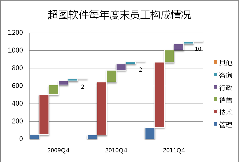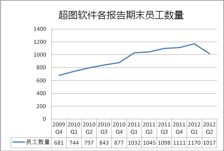 數(shù)據(jù)來源:超圖軟件相應(yīng)各期報(bào)告,雖然2010Q2、2011Q2報(bào)告未提及員工數(shù)量,但可以通過Q3報(bào)告計(jì)算得出