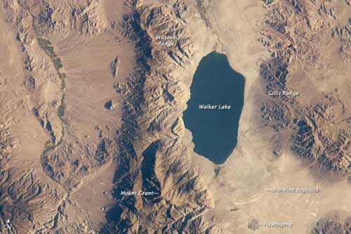 拉洪坦湖的殘跡湖中只有兩個湖終年有水——內(nèi)華達(dá)州的沃克湖和皮拉米德湖(Pyramid Lake)。上面的這幅照片是國際空間站上的宇航員于2012年7月29日拍下的,突出的顯示了沃克湖的景象。沃克湖座落在一個封閉的盆地中,東部和西部分別以Wassuk山脈和Gillis山脈為界。沃克湖由北邊的沃克河供水。沃克湖目前長約21公里,寬約9公里。
