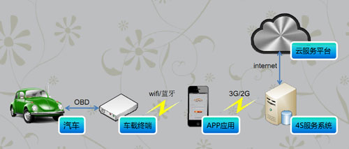 i車生活是我們之前報道過的一款手機應(yīng)用,它可通過Wifi/藍(lán)牙與車載終端(即OBD模塊)連接,讀取并分析OBD數(shù)據(jù)(發(fā)動機轉(zhuǎn)速、油耗、里程、故障代碼、排放量等),給車主一個“超級儀表盤”。其工作流程示意如下圖所示。