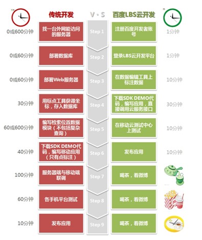 傳統(tǒng)開發(fā)與在百度LBS云平臺上開發(fā)耗時對比