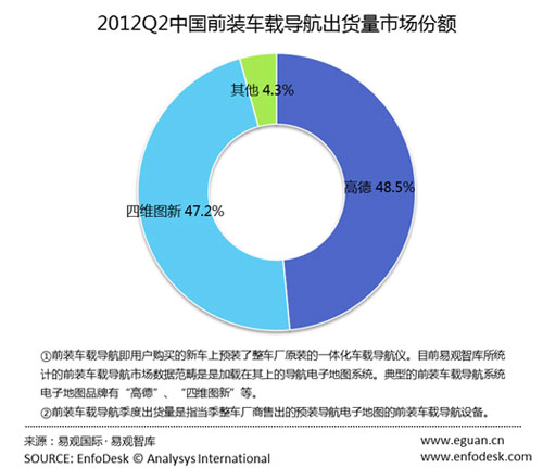 據(jù)EnfoDesk易觀智庫(產(chǎn)業(yè)數(shù)據(jù)庫)近期發(fā)布的《2012年第2季度中國前裝車載導(dǎo)航市場季度監(jiān)測報(bào)告》研究顯示:2012年第2季度,中國前裝車載導(dǎo)航市場出貨量為36.1萬臺,環(huán)比增長22.9%,特別是高德的出貨量在本季度增速明顯,圖資雙雄的市場份額仍基本維持平衡的格局。