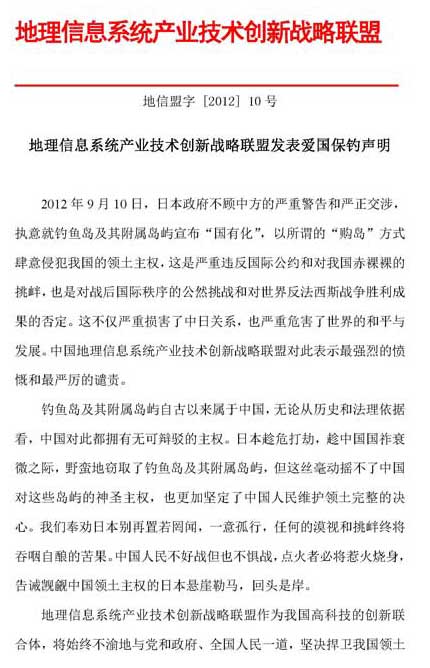 3sNews訊 近日,日本將釣魚島及其附屬島嶼宣布“國有化”的行徑遭到中國人民的強(qiáng)烈反對(duì)。作為我國高科技的創(chuàng)新聯(lián)合體,地理信息系統(tǒng)產(chǎn)業(yè)技術(shù)創(chuàng)新戰(zhàn)略聯(lián)盟發(fā)表了愛國保釣聲明,對(duì)日本的所作所為表示最強(qiáng)烈的憤慨和最嚴(yán)厲的譴責(zé)。