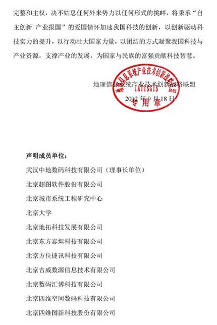 地理信息系統(tǒng)產(chǎn)業(yè)技術(shù)創(chuàng)新戰(zhàn)略聯(lián)盟作為我國高科技的創(chuàng)新聯(lián)合體,將始終不渝地與黨和政府、全國人民一道,堅(jiān)決捍衛(wèi)我國領(lǐng)土完整和主權(quán),決不姑息任何外來勢力以任何形式的挑釁,將秉承“自主創(chuàng)新 產(chǎn)業(yè)報(bào)國”的愛國情懷加速我國科技的創(chuàng)新。