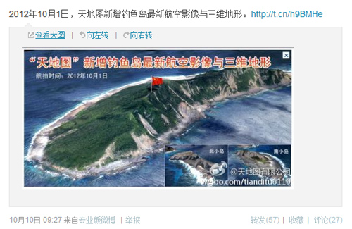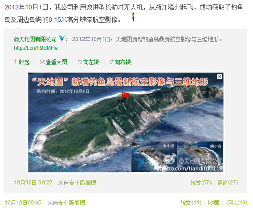 10月11日消息,天地圖有限公司10日在其官方微博發(fā)布消息稱“天地圖新增釣魚島最新航空影像與三維地形”,附加的圖片上顯示航拍的時間為2012年10月1日。
