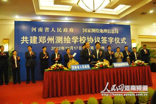 10月17日,河南省人民政府、國家測繪地理信息局共建鄭州測繪學校協(xié)議簽署儀式在鄭州舉行。國家測繪地理信息局副局長李維森、河南省人民政府副省長徐濟超分別代表國家測繪地理信息局和河南省政府在《河南省人民政府、國家測繪地理信息局共建鄭州測繪學校協(xié)議書》上簽字。