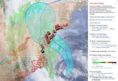 在美國東部時(shí)間10月29日這一天,谷歌定在紐約的發(fā)布會(huì)因“Sandy”颶風(fēng)而推遲。盡管谷歌這天放棄了發(fā)布會(huì),但是谷歌并沒有因此將用戶晾在一邊,而是制作了颶風(fēng)“Sandy”自己的谷歌危機(jī)地圖。