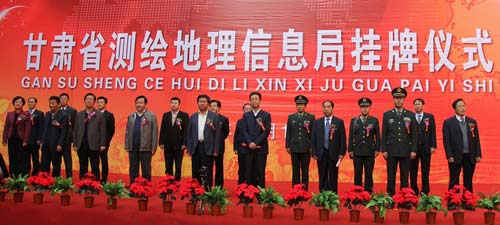 甘肅省政府辦公廳、甘肅省政府電子政務(wù)辦公室、甘肅省發(fā)改委、財政廳、國土廳、地礦局、有色地勘局、煤田地質(zhì)局、蘭州新區(qū)管委會、蘭州軍區(qū)作戰(zhàn)部、蘭州軍區(qū)測繪信息中心、蘭州軍區(qū)第一測繪大隊、甘肅省軍區(qū)司令部、交通銀行甘肅分行、中國移動甘肅分公司、中國聯(lián)通甘肅分公司、中國電信甘肅分公司,省內(nèi)10家高等院校、全省14個市州、甘肅礦區(qū)測繪行政主管部門、全省甲級和部分乙級測繪單位、武漢大學(xué)吉奧信息技術(shù)有限公司、有關(guān)測繪儀器公司等單位的負(fù)責(zé)人以及甘肅省測繪地理信息局機(jī)關(guān)全體工作人員、局屬單位班子成員和職工代表400余人參加掛牌儀式。甘肅省內(nèi)8家新聞媒體進(jìn)行了現(xiàn)場報道。