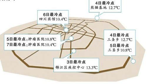 4日,三圣鄉(xiāng)和熊貓基地日均溫為12.7℃,是城區(qū)溫度最低的地方。