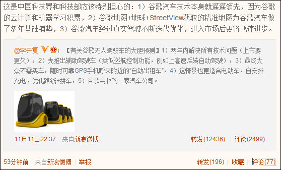 創(chuàng)新工場CEO李開復(fù)在其認(rèn)證微博上發(fā)表了對谷歌無人駕駛汽車的預(yù)測