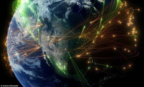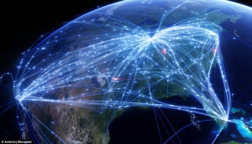 這張是美國通信基站的分布圖,使幾乎任何人都能接入互聯(lián)網(wǎng)。CGI圖像就像戶外愛好者用google earth制作航跡圖一樣,只不過這些圖是采用了龐大的數(shù)據(jù)系統(tǒng),看起來很震撼。不知道有沒有哪個(gè)達(dá)人可以繪制一張中國版的CGI圖像,是不是會(huì)更壯觀呢?