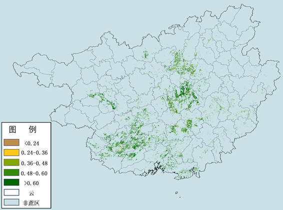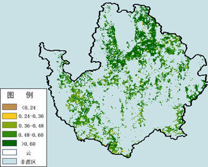 圖1. 2009年08月份廣西甘蔗種植區(qū)NDVI等級分布圖