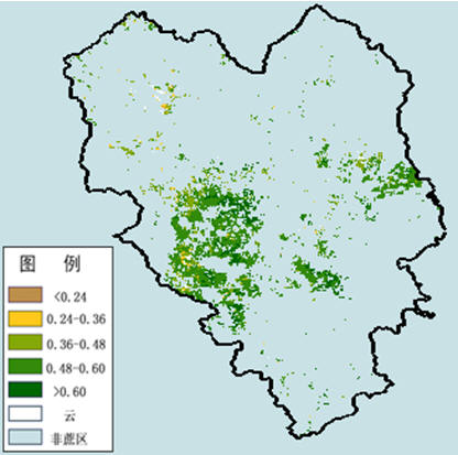 圖3. 2009年08月份貴港甘蔗種植區(qū)NDVI等級分布圖
