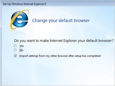 從本周二開始,用戶在安裝微軟最新版IE 8瀏覽器過程中,該軟件將會提醒用戶是否將IE 8設為默認瀏覽器,而不會再強制把IE 8設為用戶默認瀏覽器。