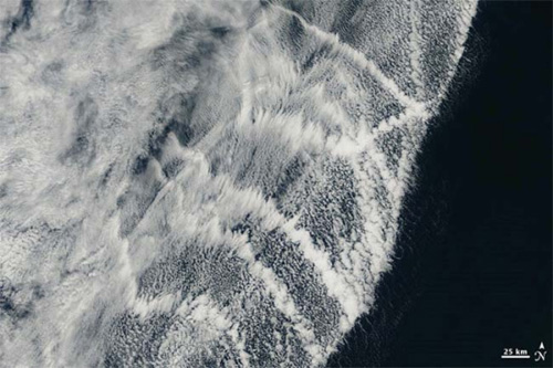 3sNews訊,據(jù)美國生活科學(xué)網(wǎng)報道,雖然船只在海洋航行,不過,它們卻能在天空留下蹤跡。10月5日,美宇航局衛(wèi)星捕捉到這種形成于北美西海岸附近云團邊緣的現(xiàn)象。白色的蹤跡顯得十分模糊,就像是飛機飛過留下的凝結(jié)尾跡,但其實那是船只排出的廢氣。