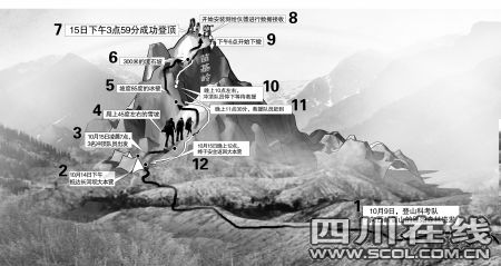 10月9日,由70多人組成的登山科考隊向西嶺雪山的原始森林進(jìn)發(fā)。經(jīng)過6天的艱難跋涉,進(jìn)山時浩浩蕩蕩的隊伍,因不同的科考活動分散在這座海拔5000多米的大山中。而帶著測量成都第一峰的任務(wù),測繪組的專家和隊員繼續(xù)向山頂挺進(jìn),終于在10月14日下午抵達(dá)主峰苗基嶺下的長河壩大本營。由于攀登苗基嶺的技術(shù)難度較高,為了安全,省登山協(xié)會專業(yè)隊員拒絕了測繪專家和電視臺記者登頂?shù)囊?,決定由李宗利、劉建和秦卓然3名專業(yè)登山隊員沖頂并執(zhí)行測繪任務(wù)。