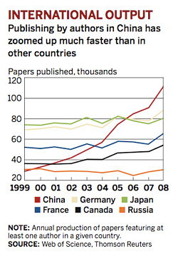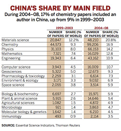 中國科學期刊雜志的產(chǎn)量在90年代中級急劇擴大,“而在近年有陡峭的上升趨勢,”根據(jù)湯姆森路透社的報道。這些發(fā)現(xiàn)都來自公司的數(shù)據(jù)庫,其中包括全球有10,500期刊發(fā)表的文章數(shù)據(jù)。