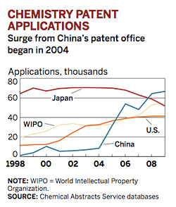 中國化學專利和論文數(shù)量不同尋常的增長是由“經(jīng)濟發(fā)展和對知識產(chǎn)權保護戰(zhàn)略重要性的認識聯(lián)合”而推動的,中美化學學會2009年主席王(Sunny Wang)認為。