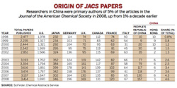 專利數(shù)局的增長率也在中國科研雜志的發(fā)表率上反映出來。根據(jù)CAS的通過SciFinder(一個收集期刊和專利文獻的研究工具)采集的數(shù)據(jù)表明,1998年中國和香港作者僅占美國化學學會雜志作者的0.8%。十年后,這個比率上升到了4.6%。