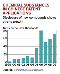 CAS的數(shù)據(jù)顯示,這些努力已產(chǎn)生了新化合物數(shù)量的巨大增長。根據(jù)湯森的筆記,中國專利申請中的新化合物在1999到2009年間增長了2400%,增加到了71000。所有化合物——包括現(xiàn)有物質發(fā)現(xiàn)新用途——從1998到2009年間增長了6600%。“這說明中國不僅在發(fā)現(xiàn)原來化合物的新用途,還在發(fā)明新化合物。”