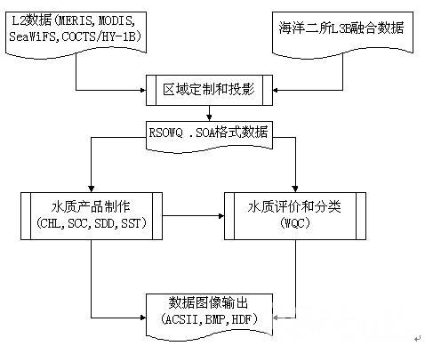 軟件導(dǎo)入HY-1B、MODIS、SeaWiFS及MERIS等2級遙感產(chǎn)品數(shù)據(jù)和海洋二所得L3B融合數(shù)據(jù),并對這些數(shù)據(jù)進(jìn)行區(qū)域定制和投影,然后從遙感數(shù)據(jù)匯中提取海洋水質(zhì)環(huán)境參數(shù),最后利用海洋水質(zhì)環(huán)境參數(shù)對指定的海洋水體環(huán)境質(zhì)量進(jìn)行評價生成評價產(chǎn)品。