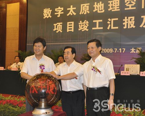 國土資源部副部長、國家測繪局局長徐德明(左),山西省委常委、常務(wù)副省長申聯(lián)彬(中),太原市委副書記、市長張兵生(右)共同開通數(shù)字太原