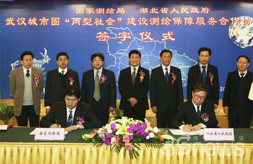 國家測繪局局長徐德明(前排左)和湖北省省長李鴻忠(前排右)簽署武漢城市圈“兩型社會”建設(shè)測繪保障服務(wù)合作協(xié)議書。建設(shè)數(shù)字中國,集成整合全國基礎(chǔ)地理信息資源,也有利于促進(jìn)對基礎(chǔ)地理信息資源的開發(fā)利用,推進(jìn)地理信息產(chǎn)業(yè)的繁榮。