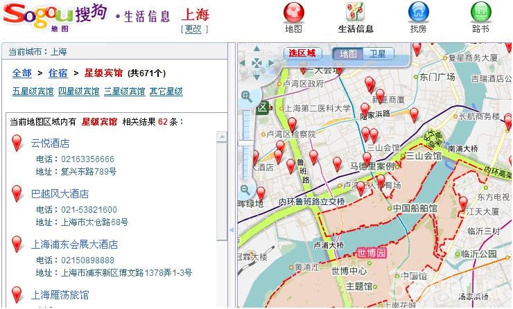 如下圖所示,搜狗地圖世博手冊的住宿信息檢索功能給出了世博園附近的酒店旅館信息,我們可以通過左側(cè)的地址和聯(lián)系電話預(yù)定好住處: