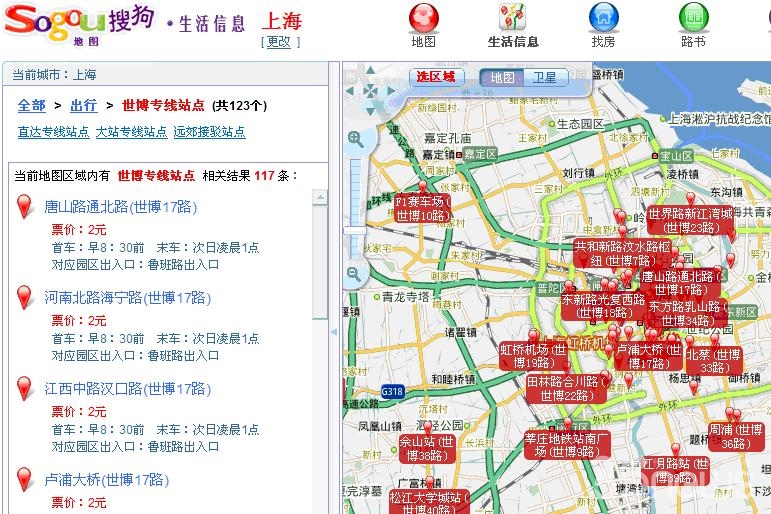 下圖所示的是搜狗地圖世博手冊所提供的世博專線站點查詢界面,詳細(xì)列出了各個站點的具體行車信息: