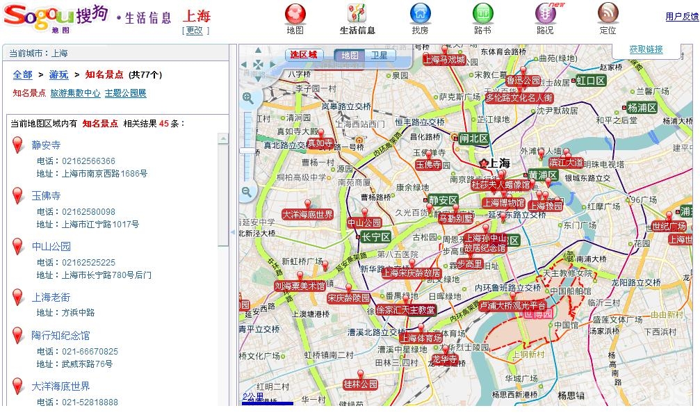 出了世博園,上海還有其他許多知名景點。來到上海一趟,除了逛世博,當(dāng)然不能錯過這些知名景點。搜狗地圖世博手冊的游玩部分,提供了上海的知名景點、旅游集散中心和主體公園,通過這些我們可以游覽這些地方,而不用去求助導(dǎo)游了: