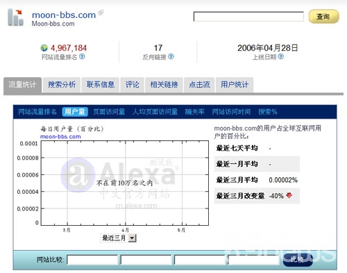 月光論壇(域名www.moon-bbs.com)是我在2006年用Discuz建立的一個關(guān)于Google Earth地標(biāo)論壇,一些網(wǎng)友會在上面注冊發(fā)帖,流量一直都很小,只有一個兼職版主管理,我有時候也去進(jìn)行管理,該論壇最近兩個月的總訪問量為2607人,平均每天28人訪問,Alexa流量基本為0,因?yàn)榭梢哉f,這個論壇并不是什么大型“軍事愛好者”的論壇,因?yàn)槠涓緵]有流量。