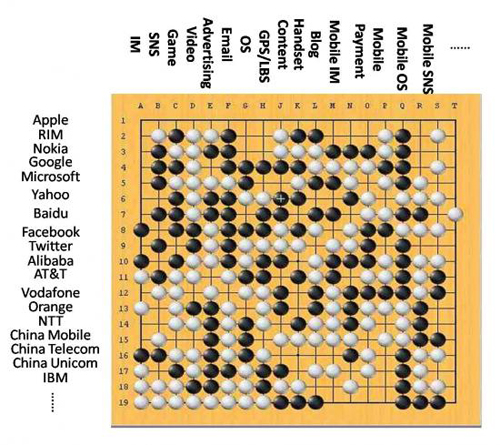 各家游戲參與者猶如進(jìn)行圍棋落子一般,在爭(zhēng)奪最終用戶的大棋局上積極布勢(shì),搶占理想產(chǎn)品體系的要點(diǎn)——IM、SNS社區(qū)、Blog、RSS、微博客、視頻、游戲、音樂、位置服務(wù)、支付服務(wù)、操作系統(tǒng)……實(shí)力雄厚的游戲參與者如Google、中國移動(dòng)等紛紛全面布局,對(duì)要點(diǎn)無一遺漏,而某一領(lǐng)域的領(lǐng)先者如Facebook、Twitter、Apple、RIM等則在自己擅長(zhǎng)的領(lǐng)域做大做深做強(qiáng),擇機(jī)而動(dòng),力圖實(shí)現(xiàn)跨越式發(fā)展……先入為主也好,后來居上也罷,你方唱罷我登場(chǎng),自研收購齊頭進(jìn)……
