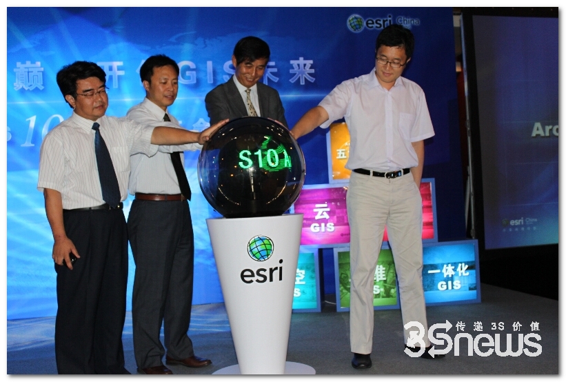 ArcGIS 10發(fā)布儀式,由左至右為ESRI中國副總裁蔡曉兵、副總裁王寶光、總裁何寧、副總裁王昊(3sNews配圖/肖振強攝)